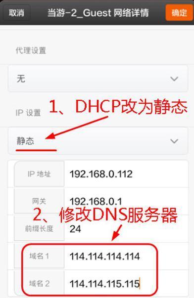 2)打开高级选项-- -》 设置DHCP改为静态 -》 手动填写DNS域名为:114.114.114.114/备用114.114.115.115。