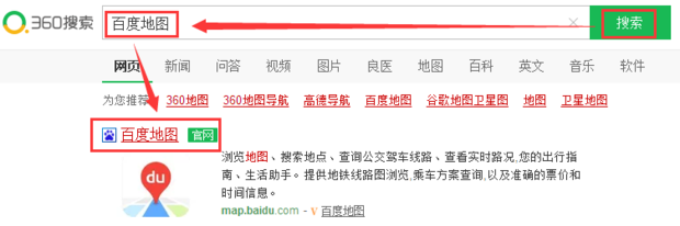 用360搜索一下“百度地图”,然后点击进入官网下载手机版“百度地图”并安装好(如下图):