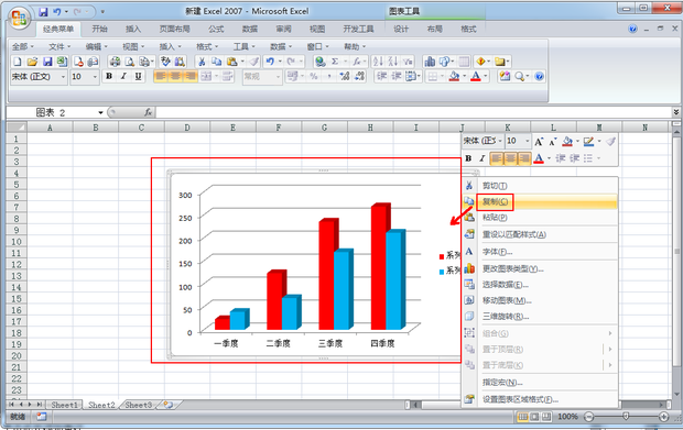 第一步:当我们看到一份好的图表后,很高兴地把它复制到PPT中,对着exce中精美的图表点鼠标右键选择复制(如下图):