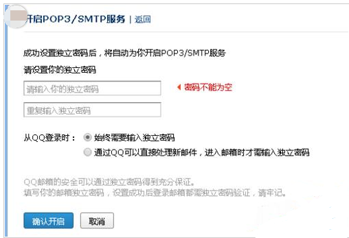 如下图所示 :使用QQ密码登陆邮箱然后会出现独立密码的界面说明设置POP和SMT开启来了。