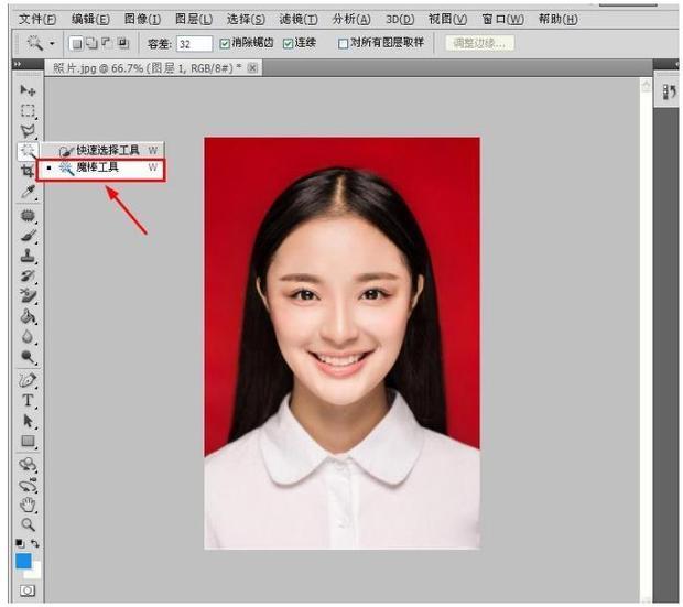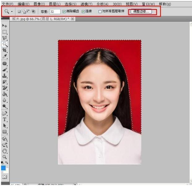 点击左栏「魔棒工具」,在照片的红色底色那里点击一下,会出现“虚线选区”。