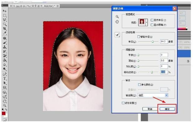 在「调整边缘」选项卡中对各参数进行调整,直到“虚线选区”最大限度的包围了红色区域。
