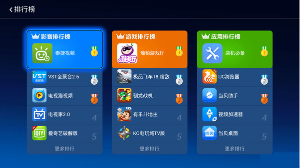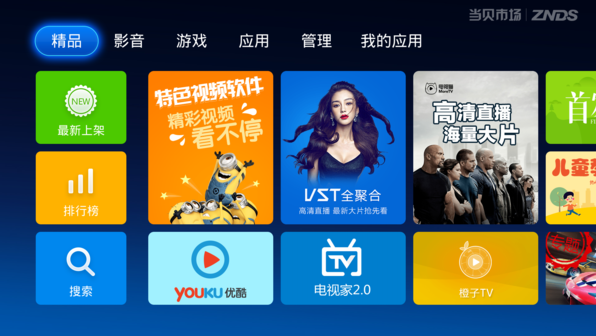 安装好之后,点击进入当贝市场后可以看到模块分类,操作遥控器可以随意选择自己想要的类别,其中最基本的就是影音类了,如需要视频直播软件,可选择泰捷视频、蜜蜂视频、电视猫视频等,如果需要点播软件,可根据自己的喜好选择优酷、搜狐、爱奇艺等。