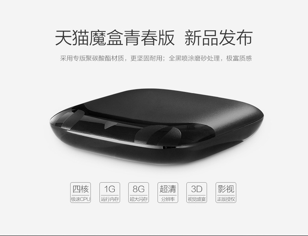 天猫魔盒M11(青春版)采用SABIC聚碳酸酯材质,有效减轻重量,同时更加坚固耐用。而外貌上也采用了萌猫的设计,但机身却采用了全黑喷涂磨砂处理,低调又极富质感,极富神秘感。质地细腻,浑然天成。