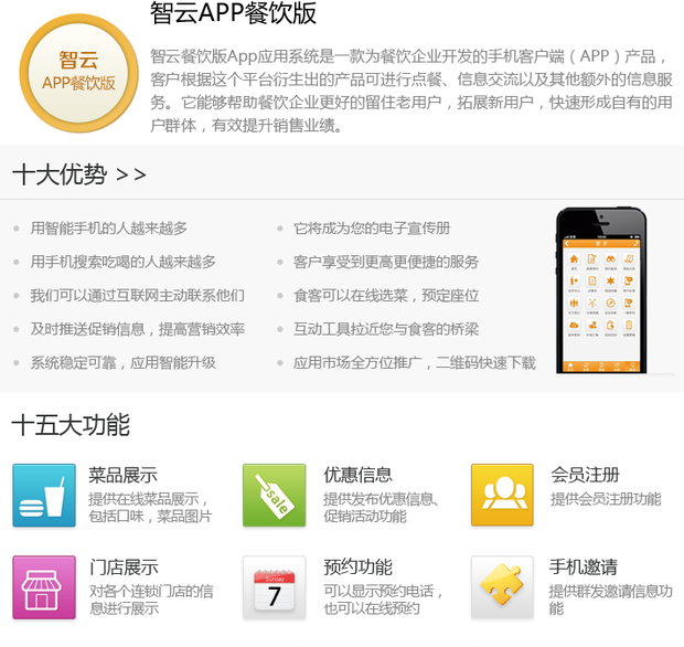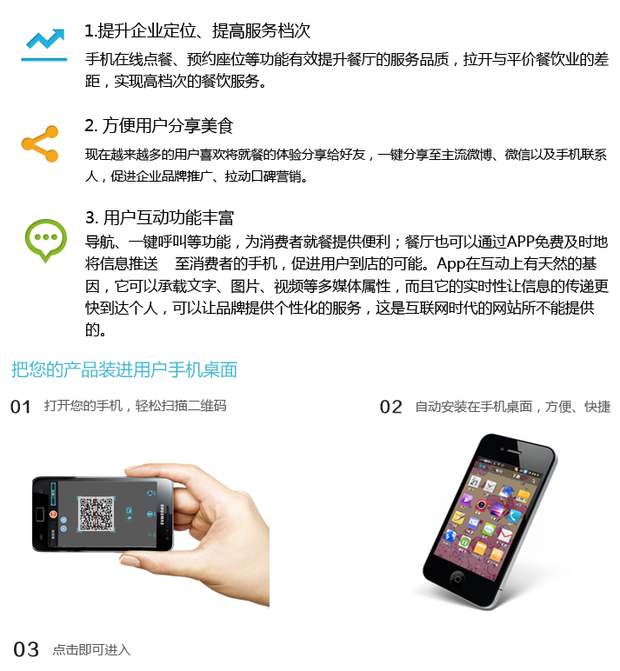 1.提升企业定位、提高服务档次:手机在线点餐、预约座位等功能有效提升餐厅的服务品质,拉开与平价餐饮业的差距,实现高档次的餐饮服务。2. App设计精美:精美的视觉设计能够充分展现餐厅环境、品牌气质、传递品牌价值、提升企业形象。生动的菜品展示,挑动食客们的味蕾。3. 方便用户分享美食:现在越来越多的用户喜欢将就餐的体验分享给好友,一键分享至主流微博、微信以及手机联系人,这样能促进企业品牌推广、拉动口碑营销。