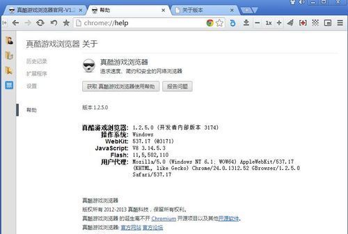 真酷游戏浏览器发布了V1.26版本,最先升级到Chrome24稳定版内核。这是在2015年1月14日,真酷游戏浏览器率先同步于谷歌Chrome24稳定版之后,第二次在众多双核浏览器中,第一个完成Chrome最新稳定版内核同步。