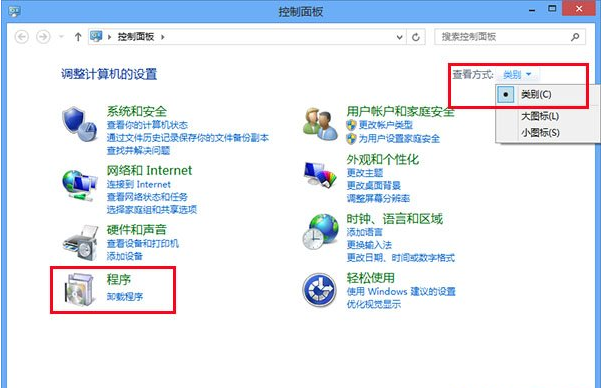 接着在打开的控制面板窗口中,将查看方式改为“类别”,然后点击“程序/卸载程序”