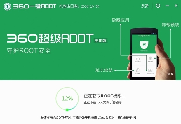 4.>>装手机驱动,手机连接电脑后会出现个类似光驱的盘,里面带有驱动,双击可安装,有些系统如XP若装不了可用360手机助手等安装驱动5.>>打开安装好的360一键ROOT(PC版),过会显示出手机型号并带有一键root按钮,按下一键ROOT,一会手机重启并root成功,如下图