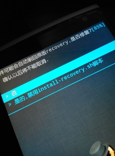 4.>>根据你ROM包的存放位置选对后即可刷包,进度条滚完即刷好,重启手机会有几分钟的等待时间,新系统开机需要先置放和优化系统里的文件另外说明,当重启手机时会提示你“是否禁用install-recovery.sh脚本”,选“否”不禁用,如下图