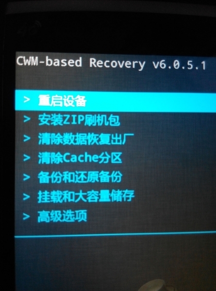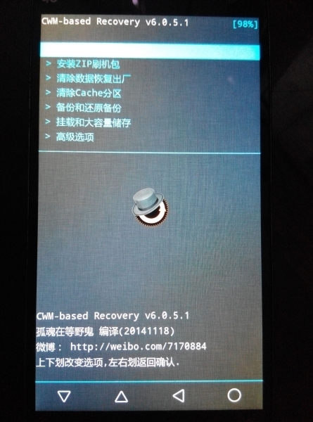 特别提醒:用360 root后不要急于卸载手机端的360应用,会导致root失败,刷了第三方recovery后再卸载也不迟!上面是root的步骤,刷写recovery也很简单,下载上面百度网盘连接的压缩包后解压,双击“点击刷入recovery.bat”,并按照界面上提示和选项操作即可成功输入recovery,若是开头就出问题刷不入,可能是一些第三方手机助手等软件占用了刷写工具的端口,建议关闭后重试,也可打开任务管理器结束掉类似带有“adb”字样的进程后再重试。下面是recovery界面图,带虚拟按键,由左到右依次为“向下”“向上”“返回”“确认”4个按键