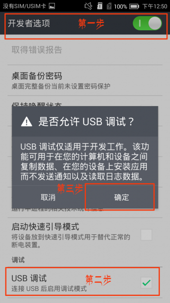 2.>>下面进入“开发者选项”,最右上方点下打开“开发者选项”功能,拉到下面在“USB调试”右边打上勾,弹出询问窗口后点确认,如下图: