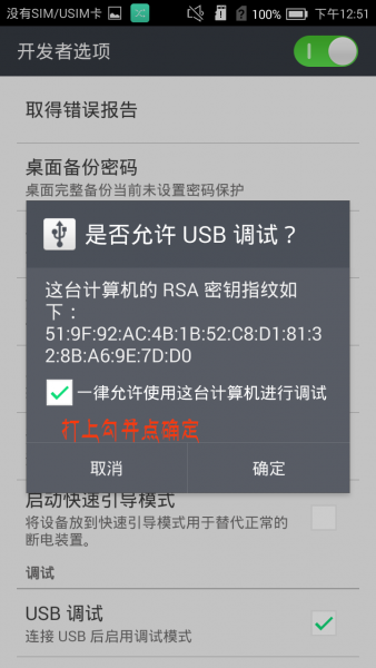 3.>>经过上面两步后,手机用数据线连接电脑,此时手机会弹出个询问窗口,打上勾并确认,若没弹出可重新关闭和打开USB调试,如下图