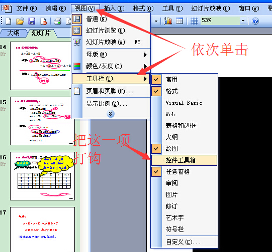 依次单击菜单栏的:视图-工具栏,找到“控件工具箱”把“控件工具箱”选定。(打“√”)。