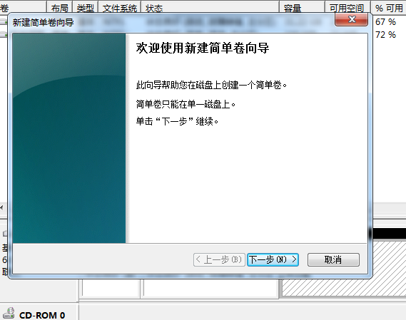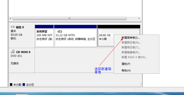 鼠标移动到未分配的分区上,然后鼠标右键单击选择新建简单卷;
