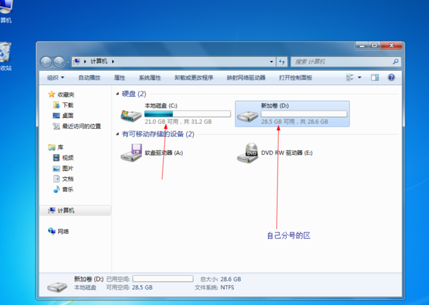 双击桌面的计算机,会看到有两个分区一个是C一个是D盘,D盘就是刚刚咱们分好的区。