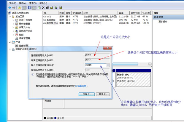 输入自己想要分给E盘的容量大小,然后点击压缩即可