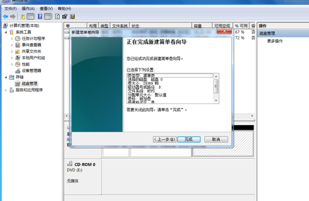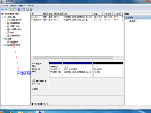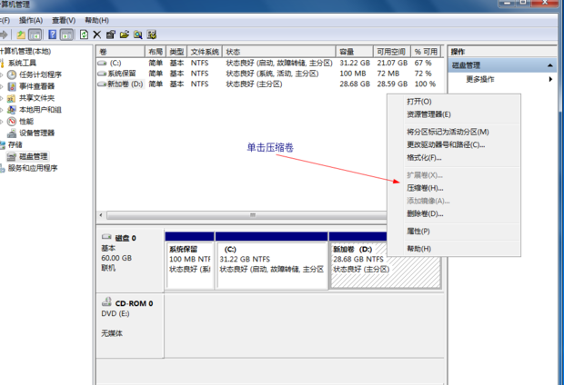 这种情况是指有未分配容量的情况下,那现在假如咱们想从D盘里分出一个E盘怎么办呢,继续打开磁盘管理然后把鼠标放到D盘上,右键单击压缩卷