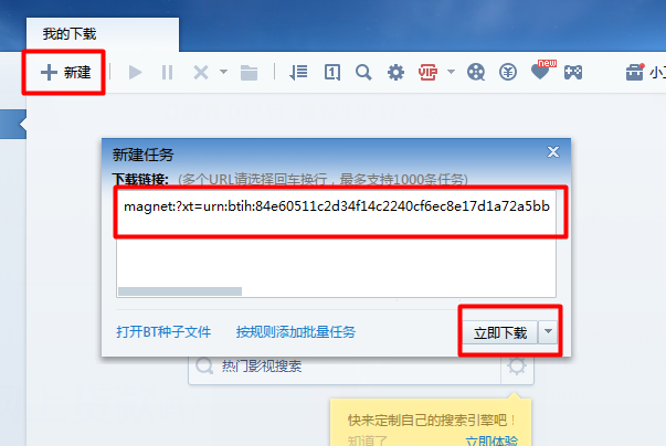 然后打开“迅雷”,新建下载任务,并将磁力链接进行粘贴,点击“下载”按钮进行下载。