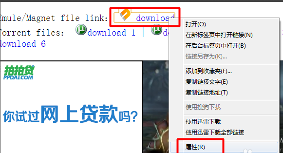 然后右击磁力链接,从弹出的右键菜单中选择“属性”项。