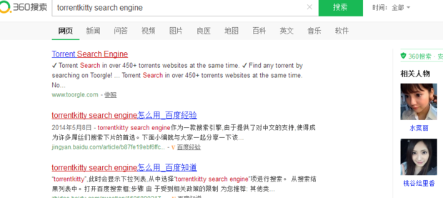 在获得了番号之后,然后借用相关搜索引擎来捕获相应电影的磁力链接啦:在360中搜索“torrentkitty search engine”,并从搜索结果列表中选择第一项进入对应搜索引擎。