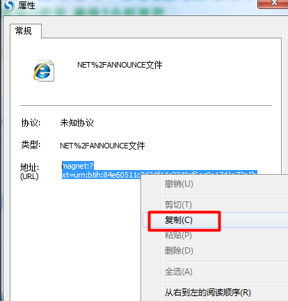 接着在打开的“属性”窗口中,将磁力链接进行复制。