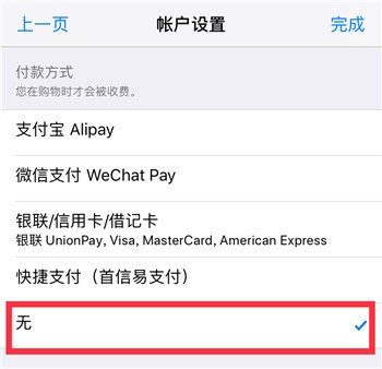 在付款方式选择“无”,然后点击完成。