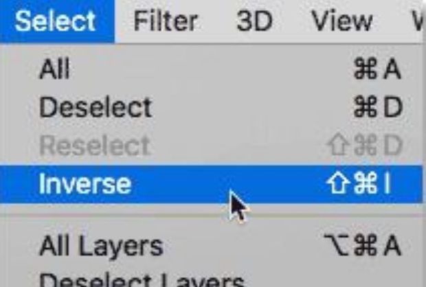 目前,我们已经选择了圆圈内的区域。我们实际需要的是选择圆圈外的区域。要取消选择圆圈内的区域并选择其周围的一切,请转到屏幕顶部菜单栏中的选择菜单,然后选择反向: