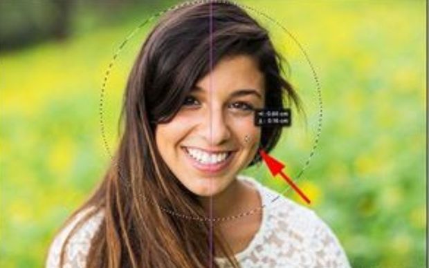 如果您没有在正确的位置绘制您的选择轮廓,只需单击选择轮廓内部并将其拖动到位置。在这里,我正在移动它,以便年轻女人的脸在圆圈中心。这是我想要保留的区域。图像的其余部分将被裁掉:
