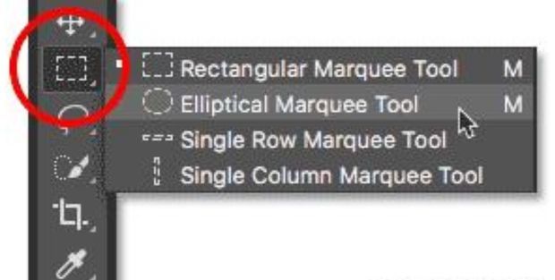 选择椭圆选框工具从工具栏中选择椭圆选框工具。默认情况下,椭圆选框工具嵌套在矩形选框工具之后。在矩形选框工具上右键单击,然后从弹出菜单中选择椭圆选框工具: