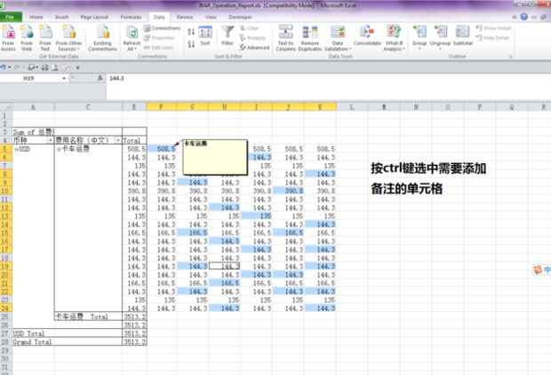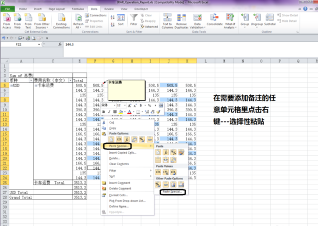 在一个单元格里面添加批注“卡车运费”,复制此单元格