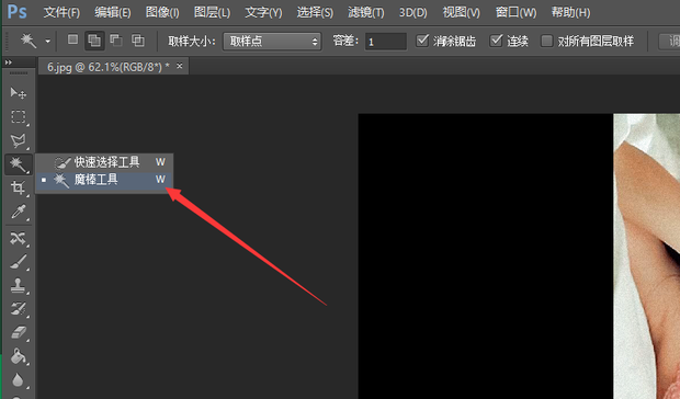画布扩大2倍后,点击左侧工具栏中的魔棒工具。选择黑色区域。