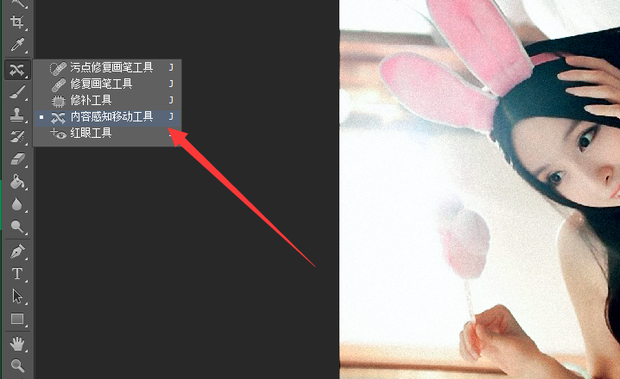 美女图像部分成为选区,点击左侧工具栏中内容感知移动工具。