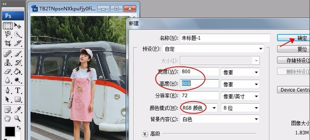 填上图片尺寸,颜色选择RGB,然后点确定;