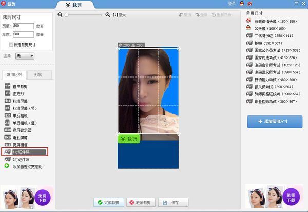 最后,点击“裁剪”选择“1寸证件照”。将裁剪框移动到合适的位置后,点击“完成裁剪”保存即可。