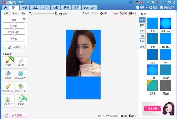 首先,使用美图秀秀打开一张照片。选择“抠图笔”-“自动抠图”,将人物主体抠出来,如图。