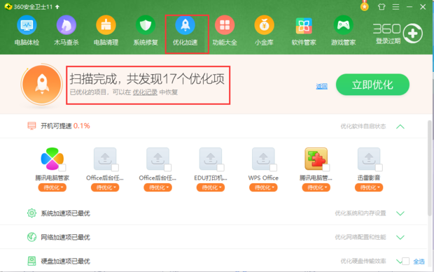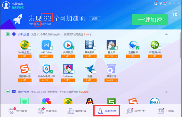 接着分别点击360主页面上方的“优化加速”和电脑管家主页面下方“电脑加速”进行检测,检测完的结果如图,360发现17个可优化项,电脑管家发现93个可优化项,两者数据同样相差过大,这是因为360的优化项是大项,电脑管家细化成了很多小项的缘故。