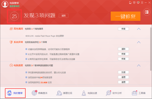 接着我们来试用一下两款软件的主要功能吧。分别点击360主页面上方的“电脑体检”和腾讯电脑管家主页面下方的“我的管家”进行体检,对同一台电脑体检后的结果如图。可以看见,360体检得分高于腾讯管家(360为41,电脑管家为25),两个的体检内容相差无几。
