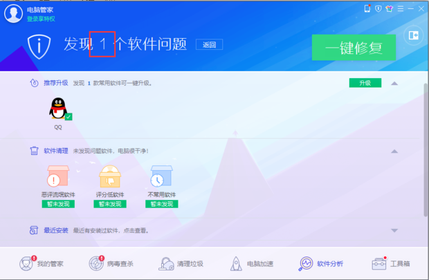 接着点击360主页面上方的“系统修复,在电脑管家主界面中没有此功能的对应。这里则点击腾讯电脑管家下方的“软件分析”功能,检测后的结果如图。可以看见,360系统修复是对漏洞的检测与修复,检测后的漏洞与电脑管家中“我的管家”功能中检测的系统漏洞不一样。电脑管家中的软件分析主要用于检测恶意软件,这使用户加强了对软件的甄别。