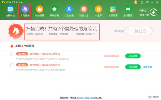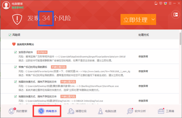 接着分别点击360主页面上方的“木马查杀”和腾讯电脑管家主页面下方的“病毒查杀”,检测完的结果如图。可以看见,360检测出了两个危险项,电脑管家则为34个风险,两者风险项相差很大。通过分析,电脑管家很多风险项在360中其实是被检测到了,但是没有作为危险项而列出。