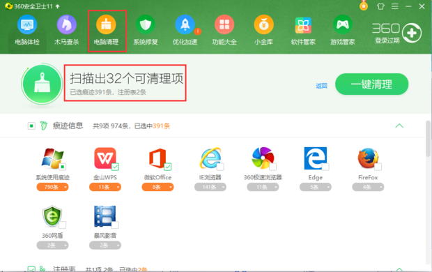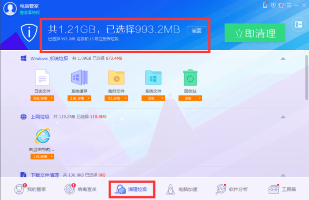 接着分别点击360主页面上方的“电脑清理”和腾讯电脑管家主页面下方的“清理垃圾”进行检测,检测完的结果如图。可以看见,360检测出32个可清理项,并未列出清理软件具体多少,电脑管家检测出“1.21GB”垃圾。360可以清理磁盘碎片,电脑管家不行,这是电脑管家的一个缺点。
