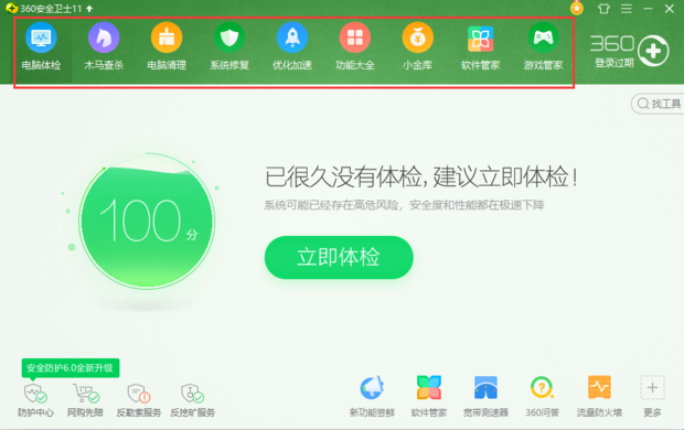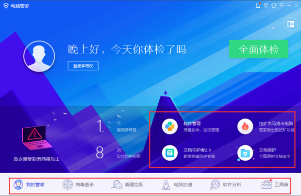 打开360主界面,可以发现上方是主要功能,提供了除保护电脑以外其他的功能。打开腾讯电脑管家主界面,主要功能位于主页面下方。可以看到,两款软件出基本的电脑防护之外都有电脑清理,电脑加速,软件管理等功能。
