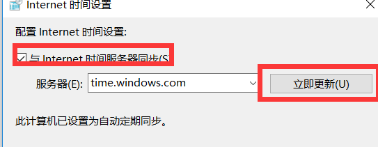 勾选“与Internet服务器时间同步”,点击立即更新即可。