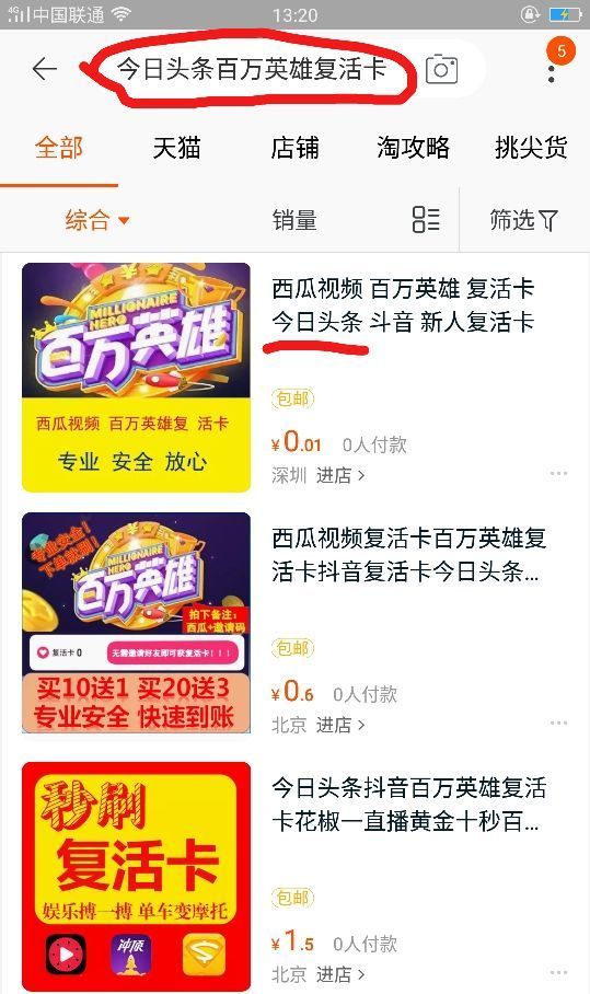 还有一种花钱快速获得复活卡的方式就是在淘宝上搜索“今日头条百万英雄复活卡”就会看到有很多的商家在售卖复活卡,就可以快速得到了。