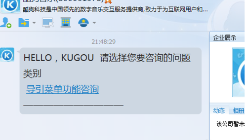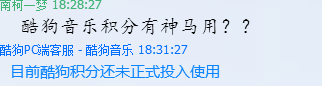 然后就会弹出一个选择性的东西 你只需要随便点击一个如果没人排队的话就最好有人排队的话就等待一下 自然客服就会主动给你发消息的 然后你就问酷狗音乐积分有什么用? 客服回答如图所示。因为现在酷狗音乐还没发布关于积分的作用,只能选择等待,积分只能在等等了,希望酷狗音乐可以快点发布关于积分的使用。