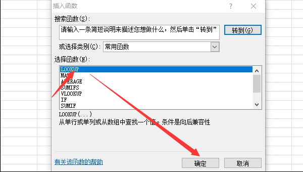 打开插入函数对话框后,找到LOOKUP函数,点击确定。