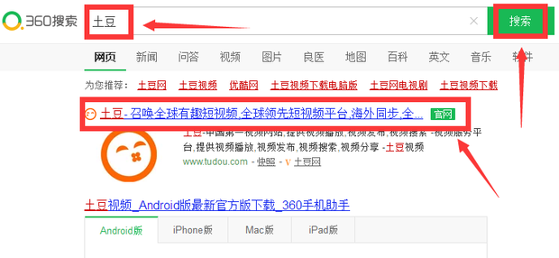 在搜索框内输入土豆,点击搜索,搜索结果出来以后,点击土豆官网