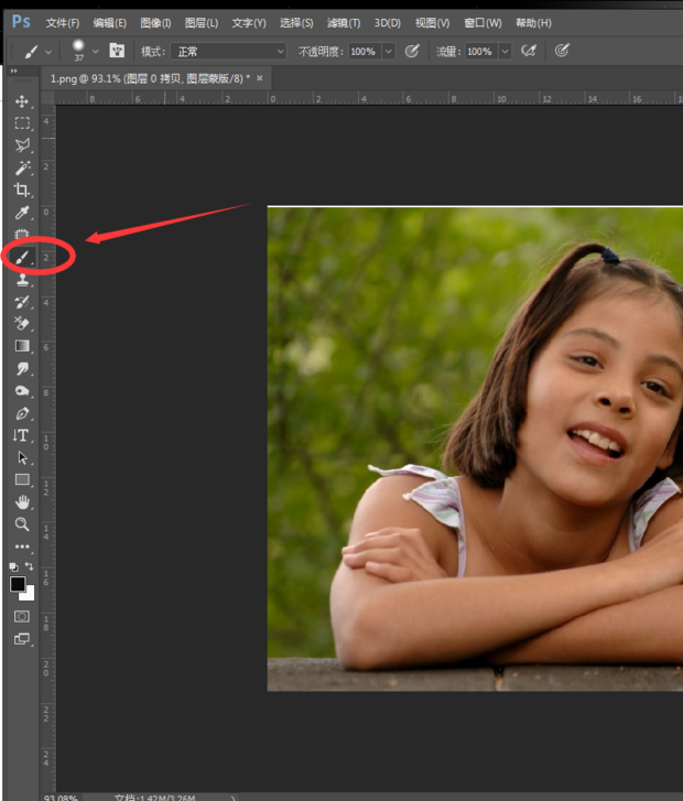 选择画笔工具,涂抹图中脸上的斑点瑕疵