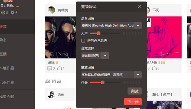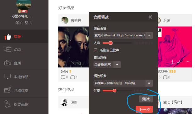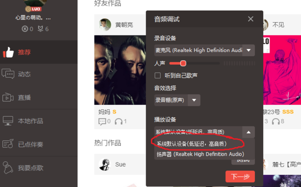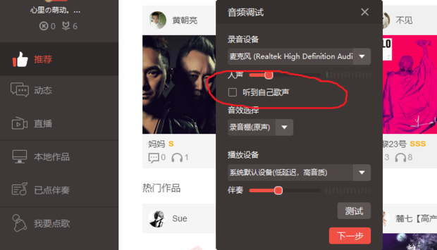 歌曲在录制完毕后,大家都会反复的听上一番,然而,电脑版全民k歌在听歌上也有许多小猫腻,这里大家最好选择一下适合自己的听歌配置,这样放出来的歌曲更动听,如下图所示!