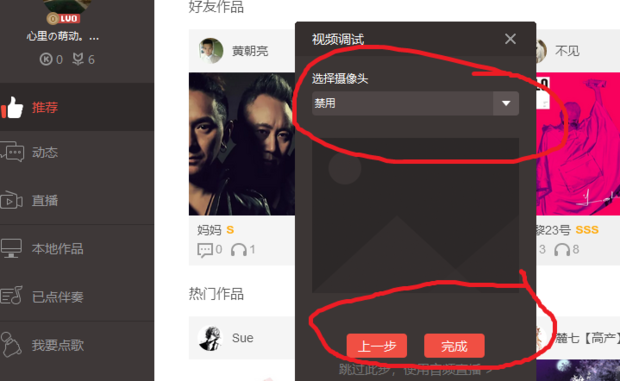 在这里可以选择关闭摄像头,许多人都用手机版录过mv,电脑版可也直接把摄像头去掉,设置方法只要点击一下就行了,全部配置完成后,别忘点击一下完成,这样所做的操作就保存了!