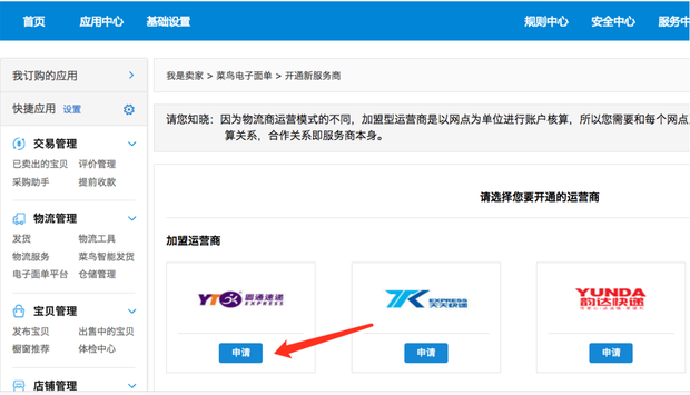查找需要开通电子面单的快递公司,然后点击相应的”申请“按钮